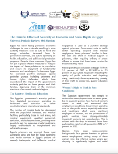 Since the last Universal Periodic Review (UPR) cycle in 2019, economic and social rights in Egypt have severely deteriorated, particularly impacting vulnerable groups such as women, rural communities, and people living in poverty, along with specific categories of prisoners and human rights defenders.