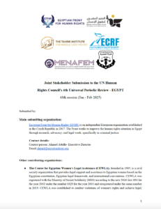The UPR is a mechanism of the United Nations created to examine the human rights records of all UN member states. According to the UPR process, the country under review submits a national report and the Office of the UN High Commissioner for Human Rights puts together one report compiling information on the country obtained from reports by the UN special procedures and treaty bodies, as well as another report informed by submissions from stakeholders, including civil society. In this vein, this contribution has been submitted ahead of Egypt’s fourth UPR cycle, with a review set to take place in January 2025.